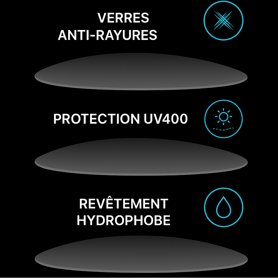 Optez pour un confort visuel haut de gamme : nos verres foncés réduisent efficacement l’éblouissement et la fatigue oculaire, que ce soit en ville, en voiture ou en plein air. Leur traitement anti-rayures garantit une durabilité exceptionnelle, tandis que le revêtement hydrophobe offre une vision toujours nette, sans gouttes ni buée.